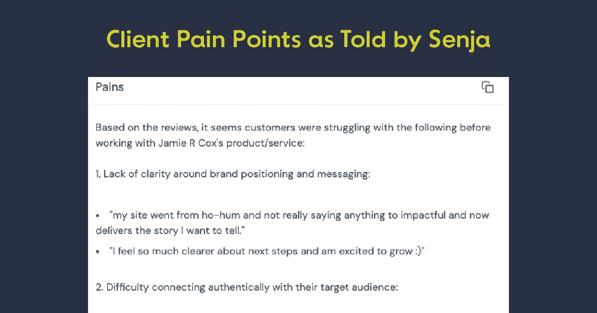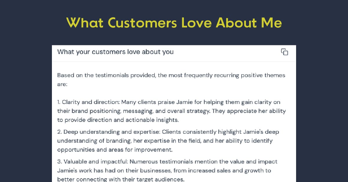 The coolest thing about Senja is its Analyze feature. Using AI, Senja mines insights from customer reviews and turns them into key points I can use in messaging. This is gold! I’ve used this to update website copy, and one Brand Quick Fix client said they booked because “It felt like you were reading my mind!”
